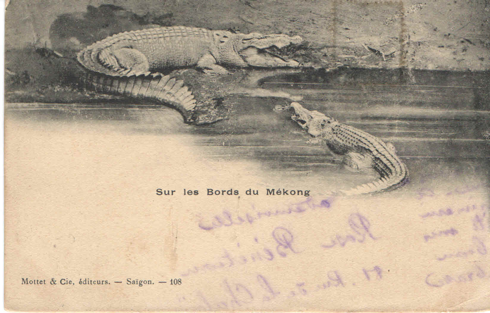 Published 14/08/2016 at 1648 × 1053 in Maman et fiston crocodiles en balade sur les bords du fleuve Mékong… Carte postale Mottet & Cie (Saigon), datée de 1908 / coll. privée.