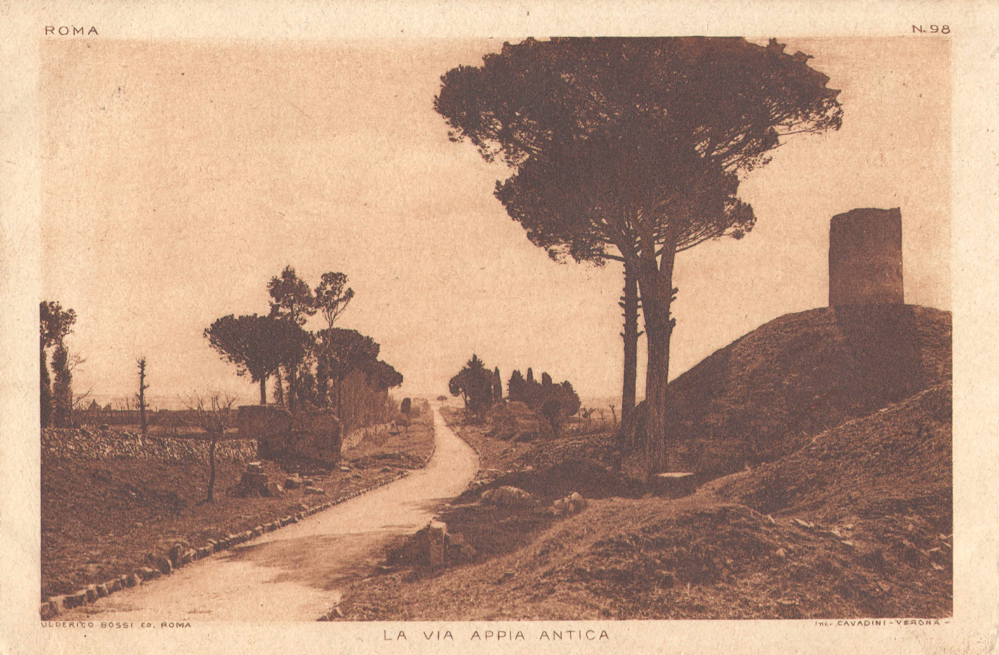 Published 31/07/2017 at 3246 × 2128 in Rome, vue de la Via Appia Antica – Carte postale Ulderico Bossi (Rome) & Cavadini (Vérone), années 1920 / Coll. privée.